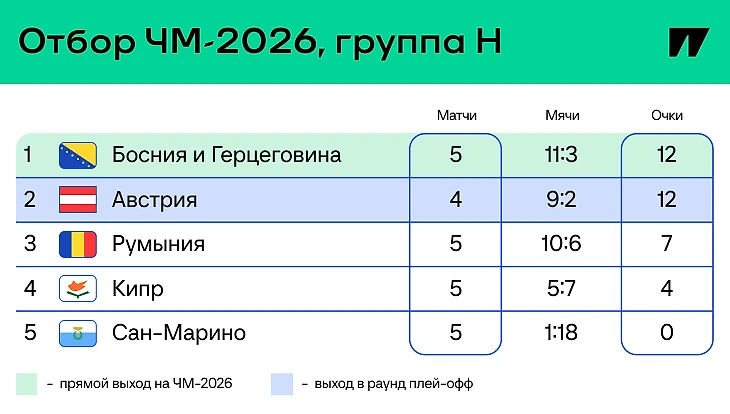 9 октября пройдут матчи Кипр – Босния и Герцеговина и Австрия – Сан-Марино, а 12-го – Сан-Марино – Кипр и Румыния – Австрия.