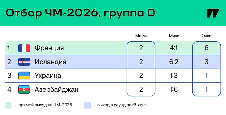 10/13 октября Франция сыграет дома с Азербайджаном и в гостях с Исландией. Украина отправится в гости к исландцам, а с азербайджанцами встретится на нейтральном поле в Польше.
