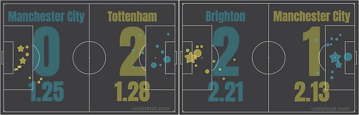 Соответствует ли старт «Сити» качеству игры? Хороший вопрос. Вот карта ожидаемых голов из проигранных матчей с «Тоттенхэмом» (0:2) и «Брайтоном» (1:2):