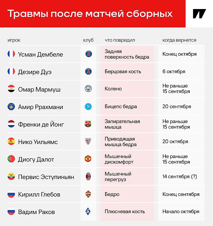 Сентябрьская международная пауза добавила проблем европейским клубам. Некоторые заметные (и даже звездные) игроки приехали с травмами после отбора на ЧМ-2026.