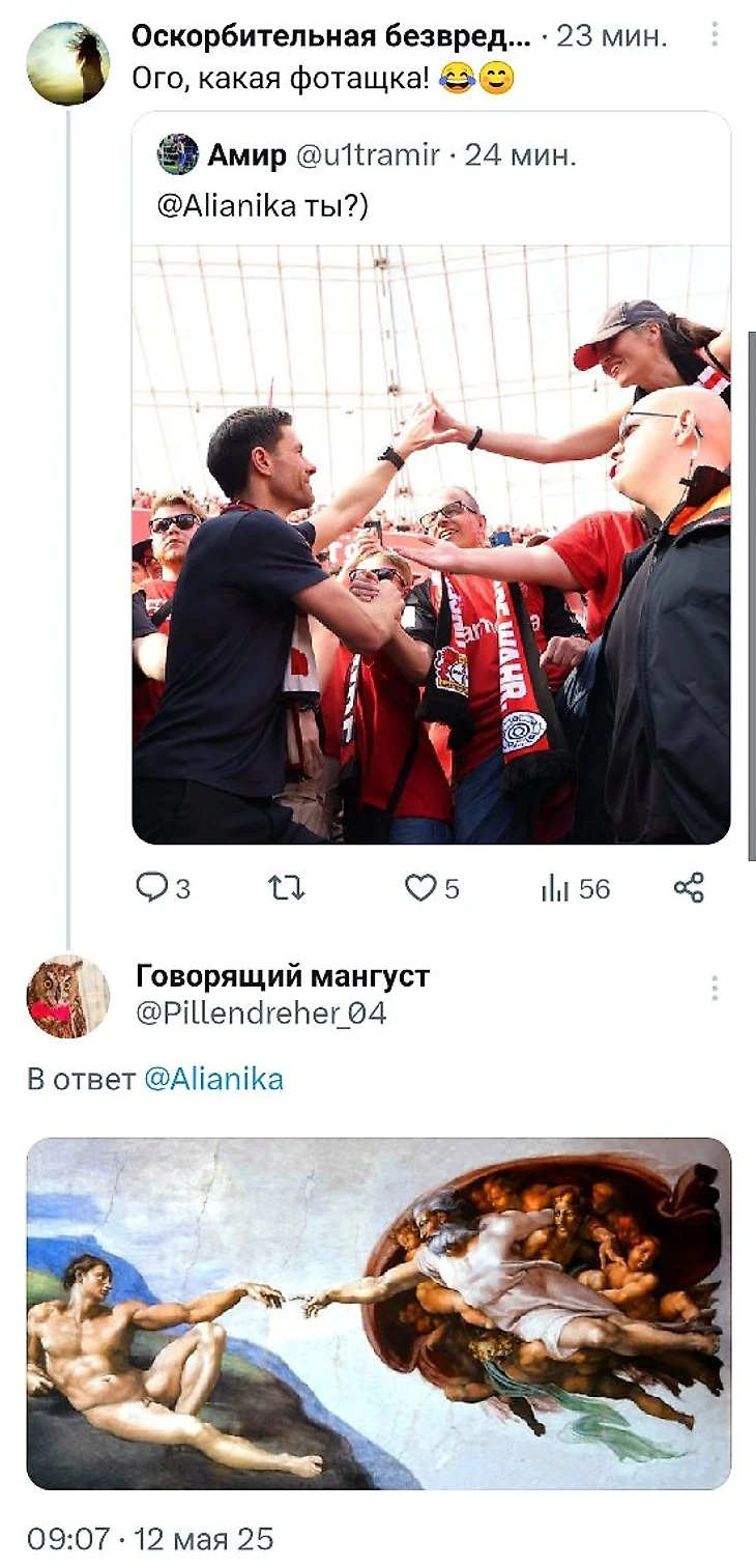 Что же до Алонсо, то он о своем решении объявил не настолько рано, чтобы фансцена «Байера» успела сообразить какую-нибудь красивую хореографию, но хотя бы смог официально попрощаться. Вышло мощно – берущие за душу кадры в слоумо на стадионных экранах под эпичную музыку, переполненные трибуны, скандирующие имя… Я на этом матче была и после того, как Алонсо сперва полез на мостик к капо, а потом прошелся по первым рядам виража, прощаясь с фанатами за руки, даже случайно попала на очень мемное фото.