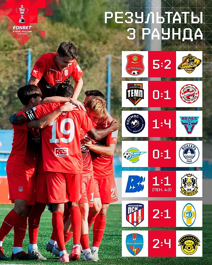Открывалась стадия одним матчем во вторник. «Астрахань» дома принимала махачкалинский «Легион». 4:0 к 20-й минуте в пользу хозяев и, казалось бы, всё ясно? Но гости отыгрывают два мяча до конца первого тайма и возрождают интригу. Правда во втором тайме камбэка не произошло, а в конце астраханцы забили еще один и в итоге одержали крупную победу. «Астрахань» в четвертом раунде сыграет с «Черноморцем».