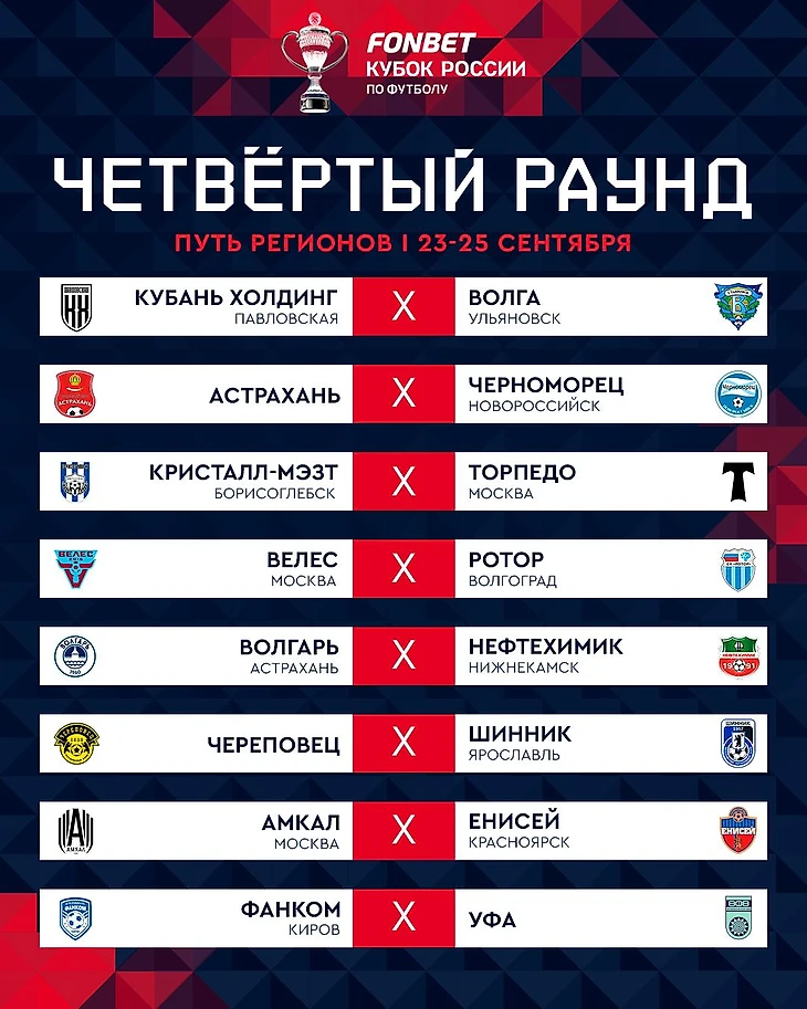 Четвертый раунд нас ждет уже через две недели. Точных дат матчей еще нет, но уже есть пары. Кроме 14 пар с командами более низших лиг есть еще две пары команд Первой лиги. КАМАЗ сыграет с костромским «Спартаком», а хабаровский СКА с «Родиной».