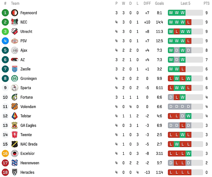 «Фейенорд» остается единственной командой, которая победила во всех играх сезона. Правда и провела на 1 матч меньше, поэтому сыграет на неделе еще перенесенную встречу с «Фортуной».