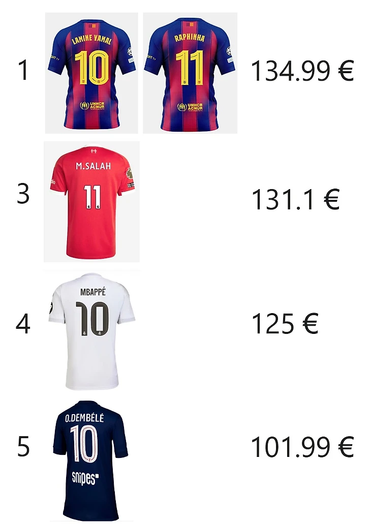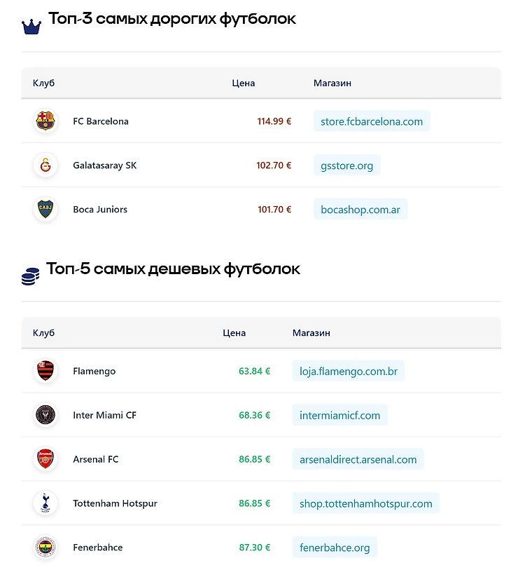 Единственный клуб, который сильно выделяется с относительно высокой стоимостью базовой футболки – «Барселона». «Галатасарай» сильно контрастирует на фоне «Фенербахче», а стоимость футболки «Бока Хуниорс» может быть сильно подвержена изменениям в курсах валют. В Бразилии другой порядок цен и возможно за 100€ в местной валюте футболка бы не продавалась, а вот для Майами 80$ кажется дешево, но там наверняка основной спрос на значительно более дорогую футболку — Месси продается за 150$ (мог бы занять 4 место в рейтинге стоимости футболок фаворитов на ЗМ-2025). «Арсенал» и «Тоттенхэм» и здесь идут рука об руку — по 86.85€, тогда как у всех остальных английских топов цена совсем немного ниже 100€.