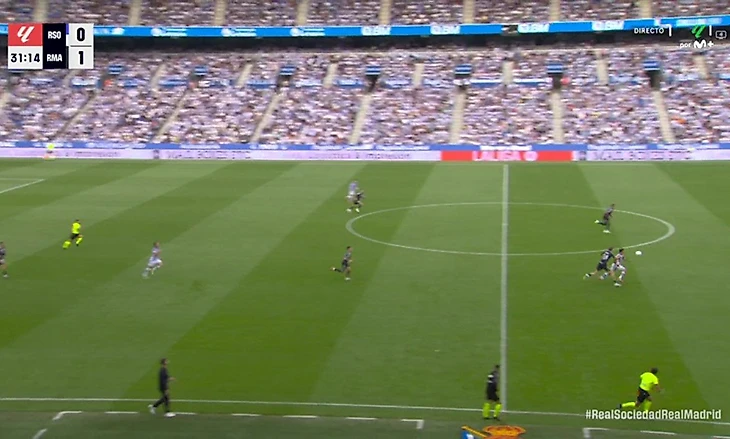 Так Алонсо моментально отреагировал на выход Таке Кубо и Арсена Захаряна – «Реал» получил сдвоенные фланги Карвахаль-Феде и Каррерас-Фран. «Мадрид» закрыл фланги, насколько это возможно. В итоге соперник лишился возможности идти в дриблинг непосредственно рядом со штрафной «Реала». В большинстве эпизодов пришлось использовать длинные передачи или забросы в штрафную – на флангах было слишком плотно.