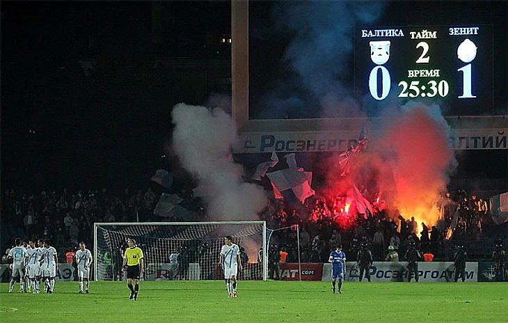 Ещё бы, тогда на стадионе(дело было ещё до появления «Ростех-Арены», игра проходила на «Балтике») будут присутствовать 14 с лишним тысяч болельщиков(что тогда составляло примерно 99% вместимости, что уже было не характерно для матчей РФПЛ тех лет, но и поведение фанов Зенита тогда вызвало, скажем так, вопросы. Это был один из первых матчей Балтики, на которых ваш покорный слуга был лично, и если честно, смотрелось это непривычно для в целом весьма культурного стадиона: дым(сигаретный и не только), какие-то петарды, внезапно какая-то женщина протащила уху на трибуны. Насмотревшись на всё это, мы с отцом решили досмотреть матч по телевизору и ушли в начале второго тайма. Но и телекартинка выглядела не лучше: болельщики, выбежавшие поле, которое по ТВ-трансляции было видно ни чуть не лучше, чем с трибун. Настолько дым застлал пеленой всю Балтику. Я тогда был ещё мал и только недавно узнал, что Петербург называют «культурной столицей». Максимально культурное поведение, чего тут сказать..