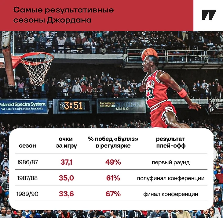 А вот лучшие сезоны «Буллз» в эру Джордана – здесь он набирает на 5-7 очков за игру меньше (и все равно очень много), а команда побеждает чаще и собирает чемпионские перстни.