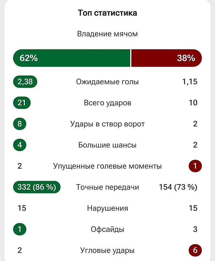 Здесь уже, в отличие от предыдущих порталов, xg не 2,3, а 2,7. Но ожидаемые голы как маркер реализации в отдельном матче я уже начал игнорировать, ведь они не лучшим образом конвертируются в реальные, и больше нужны как показатель созданной угрозы.