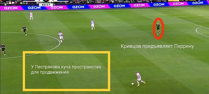Наконец к конкретике. Начнем с прессинга. Модель, думаю, все регулярные читатели выучили, так что повторяться не буду. Тут Кривцов, как и Кордоба, всегда шел до конца и не оставлял свободы для соперника, но вот партнеры подкачали (хотя PPDA «Краснодара» всего 5,3, что замечательно, но тут скорее спасибо Гудиеву, который не горел желанием разыгрывать коротко). Вот, например, момент, где из-за опозданий Са и Оласы «Акрон» смог дойти до центра поля в 3 передачи.