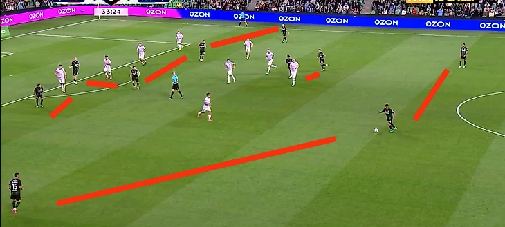 Структура «Краснодара» в первом тайме оставалась в 3-2-5, но ближе к варианту из матча с «Локо», а не с «Крыльями», то есть с меньшим количеством ротаций и стабильно третьим защитником при розыгрыше Оласой. Причина однозначно в стартовом составе: Ленини и Аугусто любят управлять игрой, Кривцов – завершать, а Сперцяну скорее всего плевать – где скажут там и будет разрывать. Немного позанудствую: номинально в паре опорников выше играл Аугусто. Во втором тайме эта информация нам пригодится.