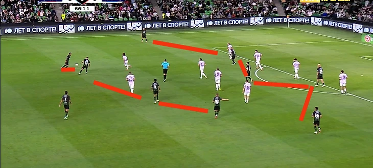 Слишком низкое расположение обороны влечет за собой полное отсутствие давления на билд-ап соперника. И в перерыве в штабе черно-зеленых подумали: «А зачем нам сразу 3 игрока в первой стадии, если опорникам никто не мешает?». Решение было весьма экзотическим и радикальным–переход с 3-2-5 на 1-4-5.