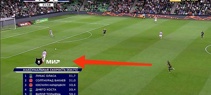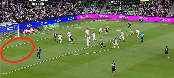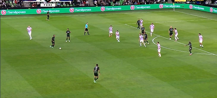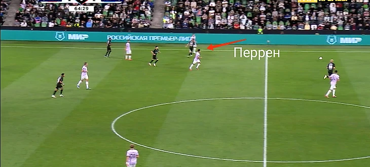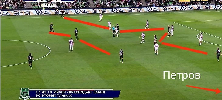 Собственно, на скрине с моментом 4-6 можно рассмотреть весь рисунок позиционных атак «Краснодара»: центр перегружен, а фланги без сопротивления. Уже через несколько секунд мяч отправился в толпу, и в результате скидки на третьего Аугусто получил прекрасный момент, лишь немного не попав в дальний.