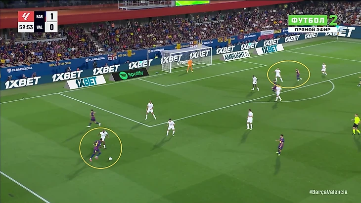 Здесь важно фиксировать изменение динамики. Бардагжи меньше Ямаля склонен идти в дриблинг на фланге. Руни предпочитает либо смещения к центру, либо просто отдавать простые передачи на сохранение. Например, здесь отдал Касадо вместо попытки обвести игрока «Валенсии» на фланге.