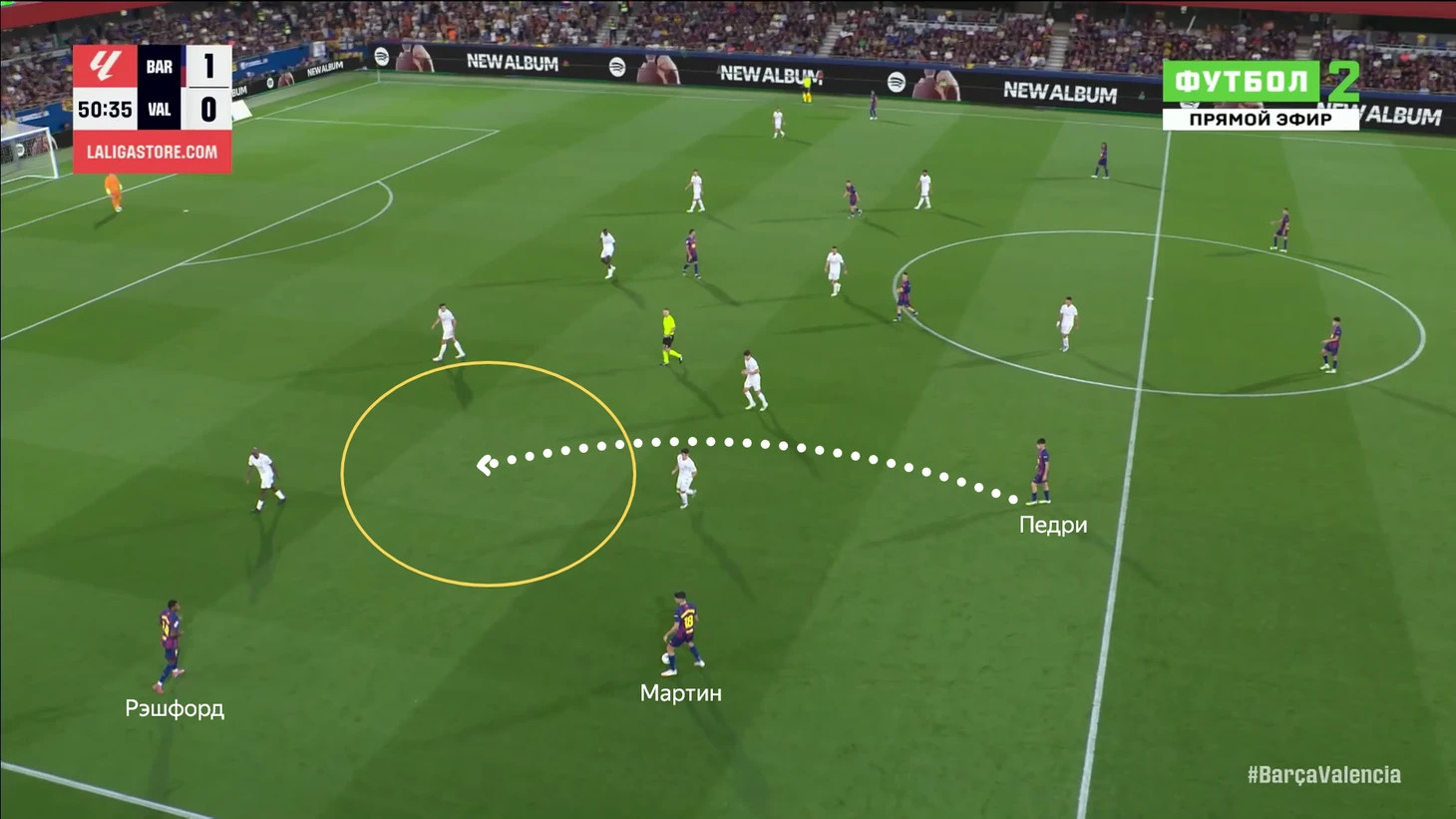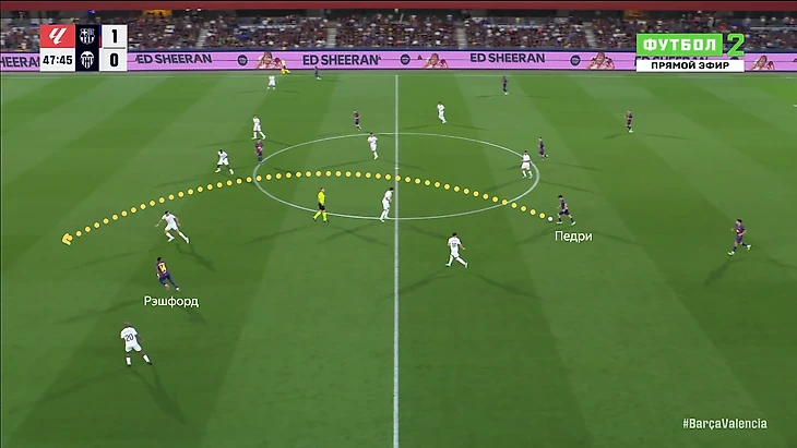 Но против «Валенсии» Алекс отсутствовал, поэтому выход менее скоростного и атакующего Мартина был вполне уместен: он реже шел вперед и больше страховал Рэшфорда. Также в таком варианте Педри может заполнять полуфланг и дабвлять криатива в этой зоне.