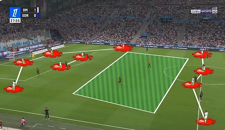 Если защитник не успеет и нападающий сможет развернуться или отдать точную передачу в касание – «Марсель» получает численное равенство или перевес в атаке и в большинстве случаев доводит ситуацию до голевого момента.