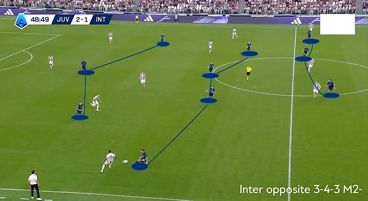 Киву работает по заветам Индзаги: всё те же 3-4-3 (фото 1) и серьёзный акцент на ротацию позиций. «Интер» с первых минут выглядел как старая версия под Симоне — свежо и агрессивно. Задача была жёсткая: вскрыть плотный блок «Ювентуса» с пятёркой в обороне и не попасться на контратаку.
