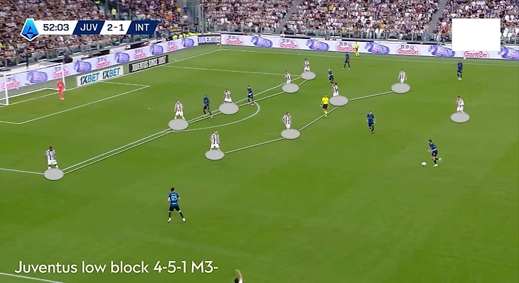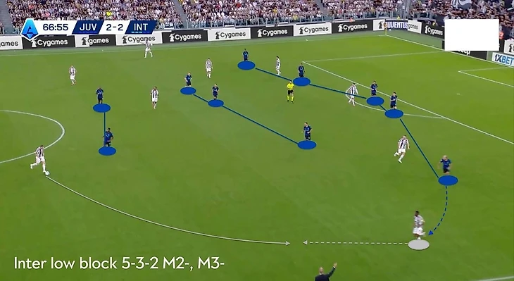 «Интер» отвечал тем же, выстраиваясь в привычное 5-3-2 (фото 6), когда приходилось сдерживать соперника. Прессинг обеих сторон практически не работал: «Ювентус» не навязывал давление, а «Интер» в своей третьей зоне и вовсе не встречал активного сопротивления.