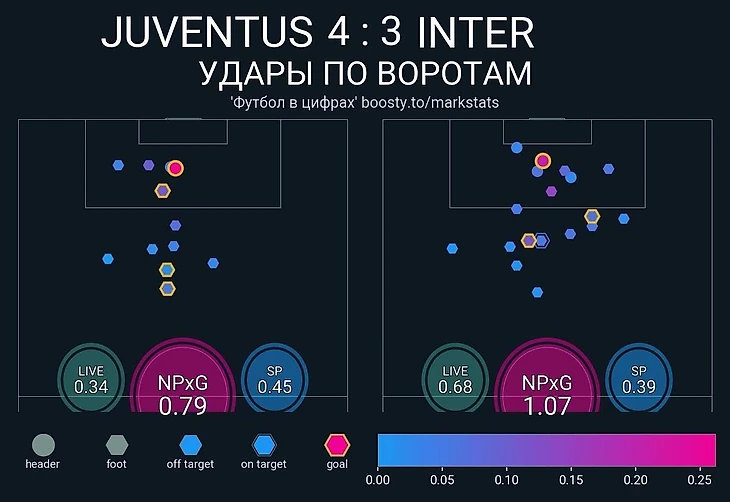 Да, «Интер» доминировал по статистике и контролю мяча, но «Юве» не выглядел безнадёжно по xG: 0,4–0,48 в первом тайме, ~0,39–0,59 во втором. Иными словами, несмотря на рисунок игры в пользу миланцев, у туринцев тоже были свои моменты, и именно индивидуальное качество помогло вытащить матч.