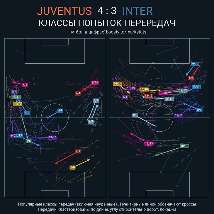 «Юве» терпел и ждал своего шанса. Посмотрите на высоту обороны у обеих команд (фото 2), карту передач (фото 3). По характеру передач видно, что «Интер» катал мяч вокруг блока, но найти разрыв было сложно. Что делать в такой ситуации: кросс и навесы! «Интер» часто бомбил в штрафную «Ювентуса» кроссами.