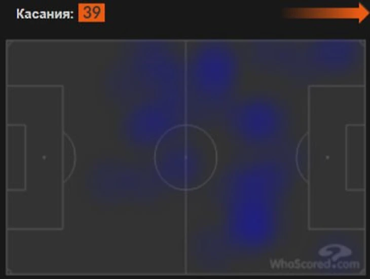 По тепловой карте видно, что аргентинец был везде, но почти не был замечен в лакомом радиусе 18 метров от ворот соперника (самой опасной зоне для атаки).
