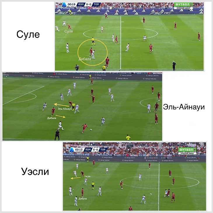 В сценариях когда Дибала опускается в центр или на фланг, нужны игроки, которые будут делать рывки за спину обороне «Торино». Другими словами, создавать глубину атаки. Эти функции разделились между тремя игроками: Суле, Эль-Айнауи (они чаще оказывались на острие) и даже латералем Уэсли.