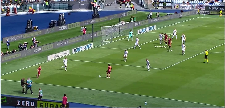 2) Проблемы возникали в моменты, когда мяч у римлян оказывался в зонах для фланговой подачи. В штрафной площади, как правило, оказывались все те же Суле и Эль-Айнауи. Адекватного адресата для подачи просто не было.