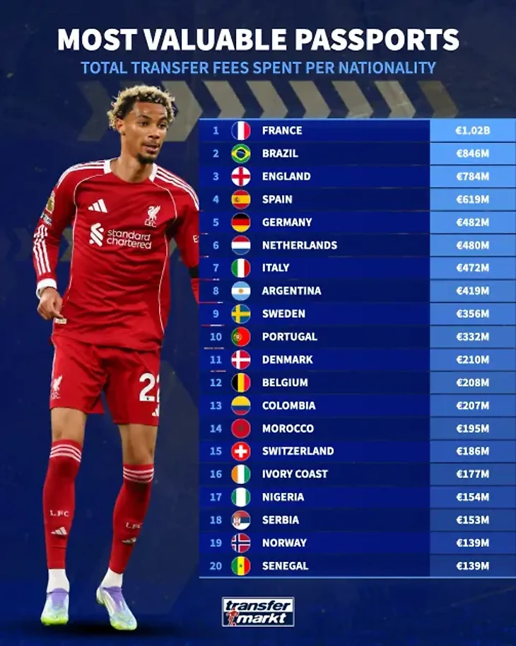 🥇 Франция — €1,02 млрд (главным образом за счет количества сделок, а не мега-трансферов; крупнейший — Юго Экитике в «Ливерпуль» за 95 млн евро)