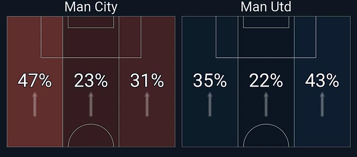 Самое интересное - грубо говоря Юнайтед и Сити поменялись ролями. В прошлых матчах Горожан наказывали контратаками, чего не было в этой игре. Первый тайм в целом показался неудачным для команды Гвардиолы: тяжело проходили выходы из обороны через короткий пас, провалы и ошибки(!) со стороны Родри, неудачные переводы мяча на фланг Жереми Доку. МанСити очень помог гол Фила Фодена после шикарного прохода Доку. После этого команда выдохнула, их игра стала заметно расслабленнее. Первый тайм в целом оказался более доминирующим для Гвардиолы, чем второй(владение 60%, Xg в 10 раз выше).