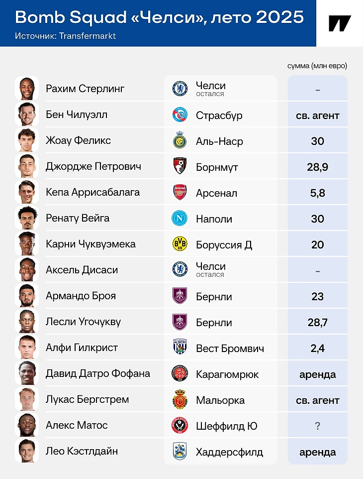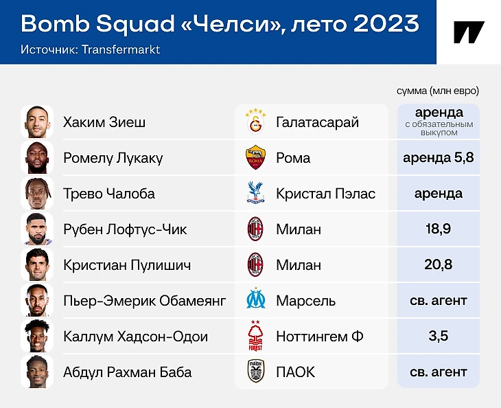 Практика bomb squad пришла в «Челси» вместе с новыми владельцами. За сезон-2022/23 руководство определилось с ненужными футболистами. В первый состав отверженных вошли восемь игроков.