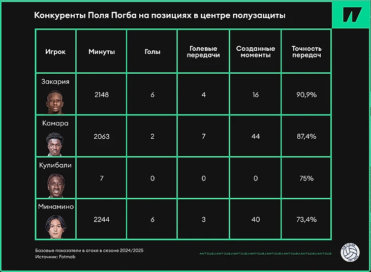 Если рассматривать позиционно, то потенциальными конкурентами Поля в составе становятся Закария и Камара. Первый – важный оборонительный полузащитник команды. Потерял себя поначалу, но в прошлом сезоне доказал свою значимость – особенно в концовке. Второй – играл менее стабильно, но все же выдавал неплохие отрезки. Также нацелен на игру в оборону, хотя имеет отличный потенциал в продвижении мяча вперед – парню всего 21 год. Существует версия, что Погба будет играть выше привычного для себя и тогда его конкурентом может стать Минамино. Хотя для японца это и непрофильная позиция, он отлично показывает свои навыки в центре, сочетая роли «восьмерки» и «десятки».