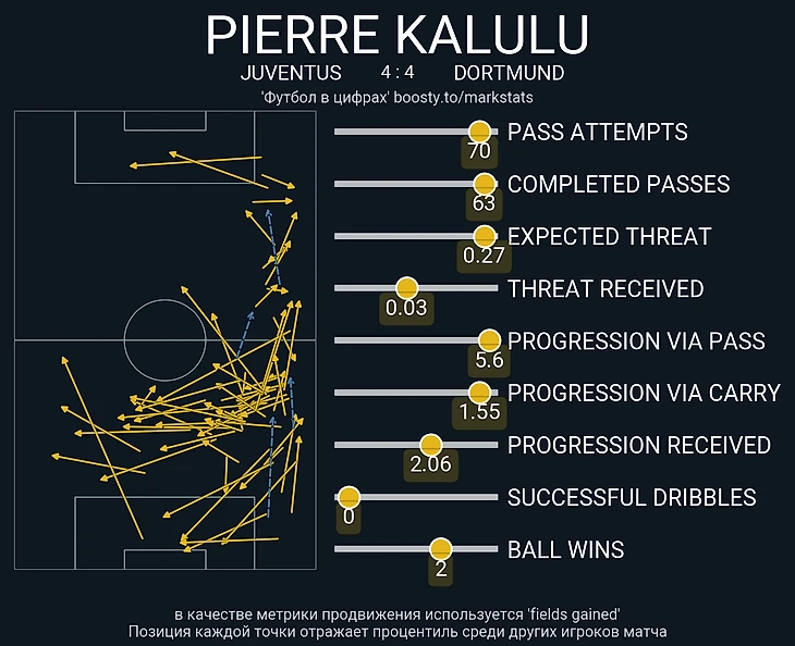 Через правый фланг шло 36% атак (через левый шло столько же), но именно через правый край мяч двигался лучше всего, и именно благодаря Калулу. Его статистика просто потрясает.