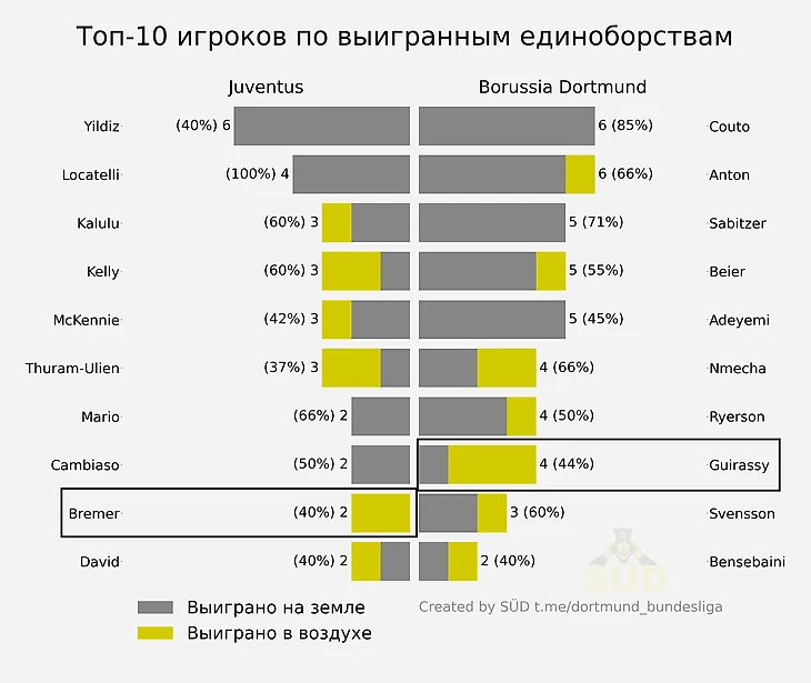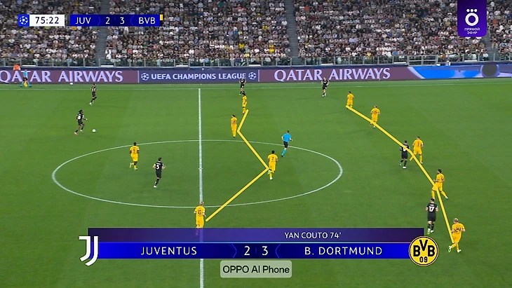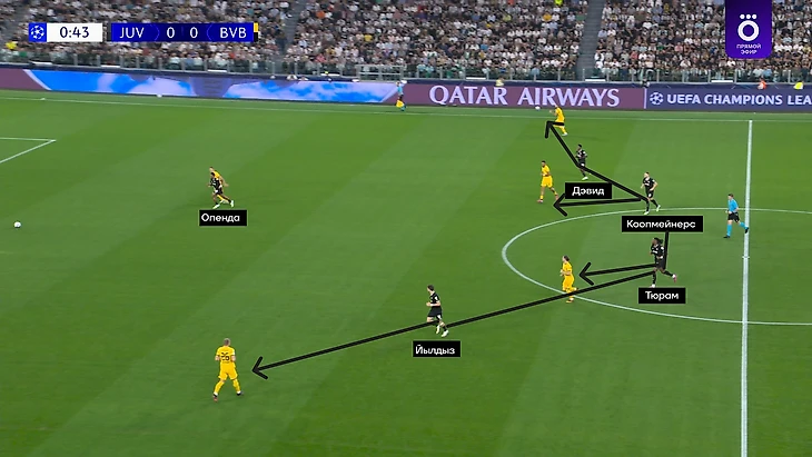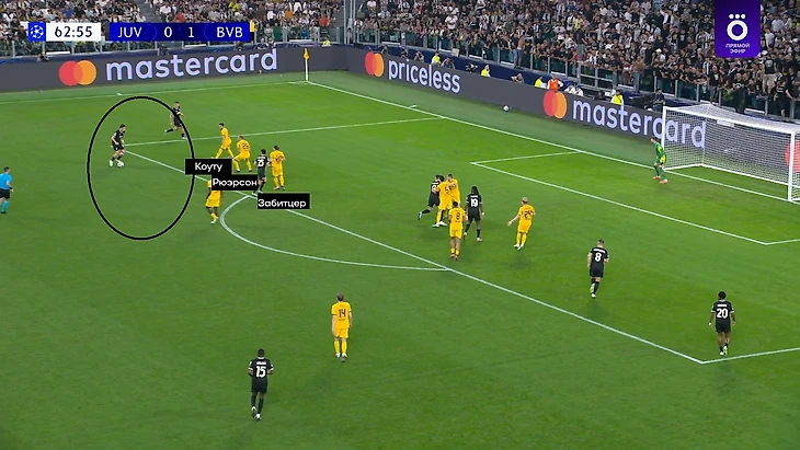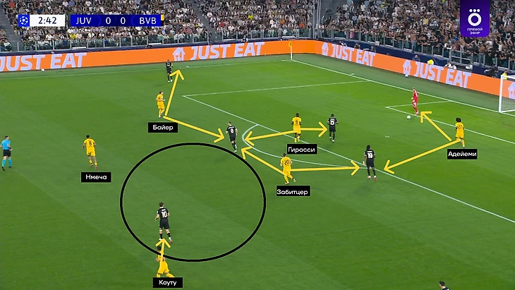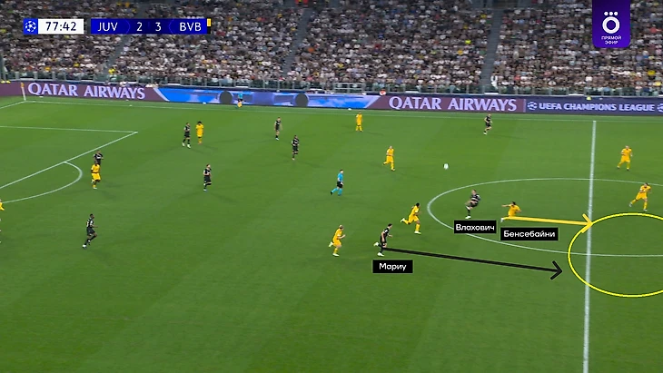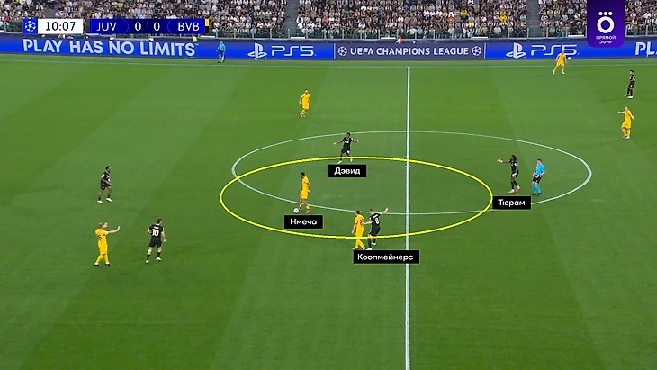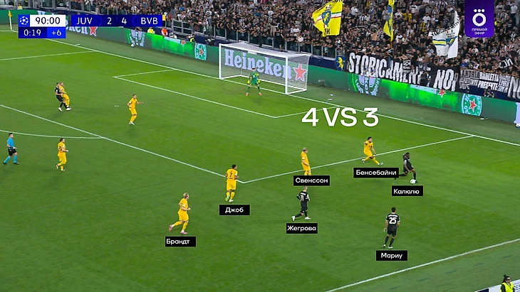 4 игрока у «шмелей» здесь оказывались нечасто, ведь Брандт и Джоб действуют выше. В случае быстрых атак против троих игроков «Ювентуса» оказывались его 2 футболиста «Дортмунда.