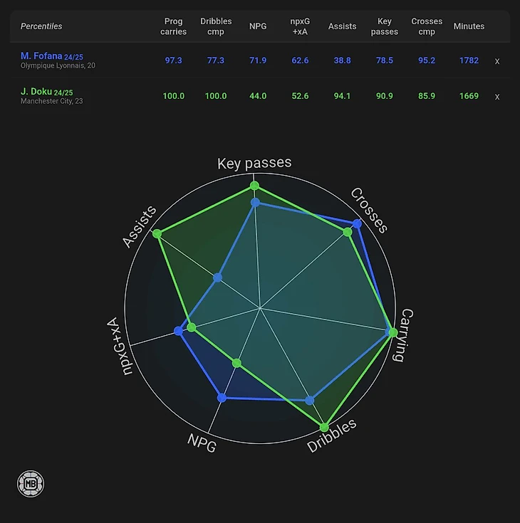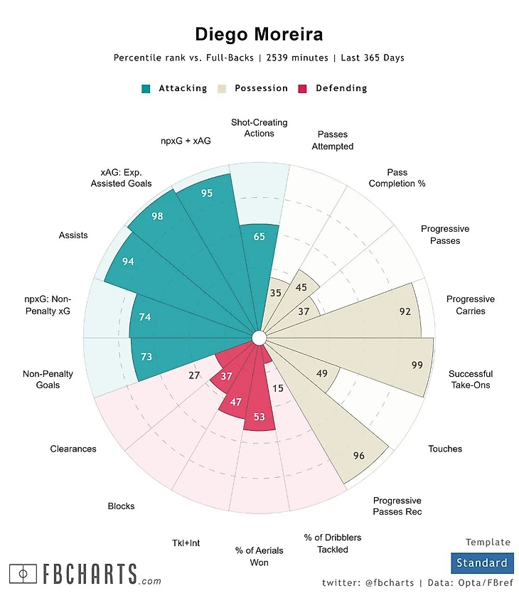 Суперуниверсал, что неудивительно для подопечного Росеньора. Недавно выбравший бельгийскую сборную Диего шикарен в физическом футболе. Он выигрывает кучу единоборств, великолепен в дриблинге (1.8 успешных обводок + 50% успеха) и обострение (топ-1% на своей позиции по xA). Играя вингбэка/фуллбэка он редко идёт в отбор, но читает игру в обороне на зрелом уровне. Честно говоря, удивительно, что он не перешёл в топ-клуб летом. Потолок тут, по-моему, выше Фримпонга.