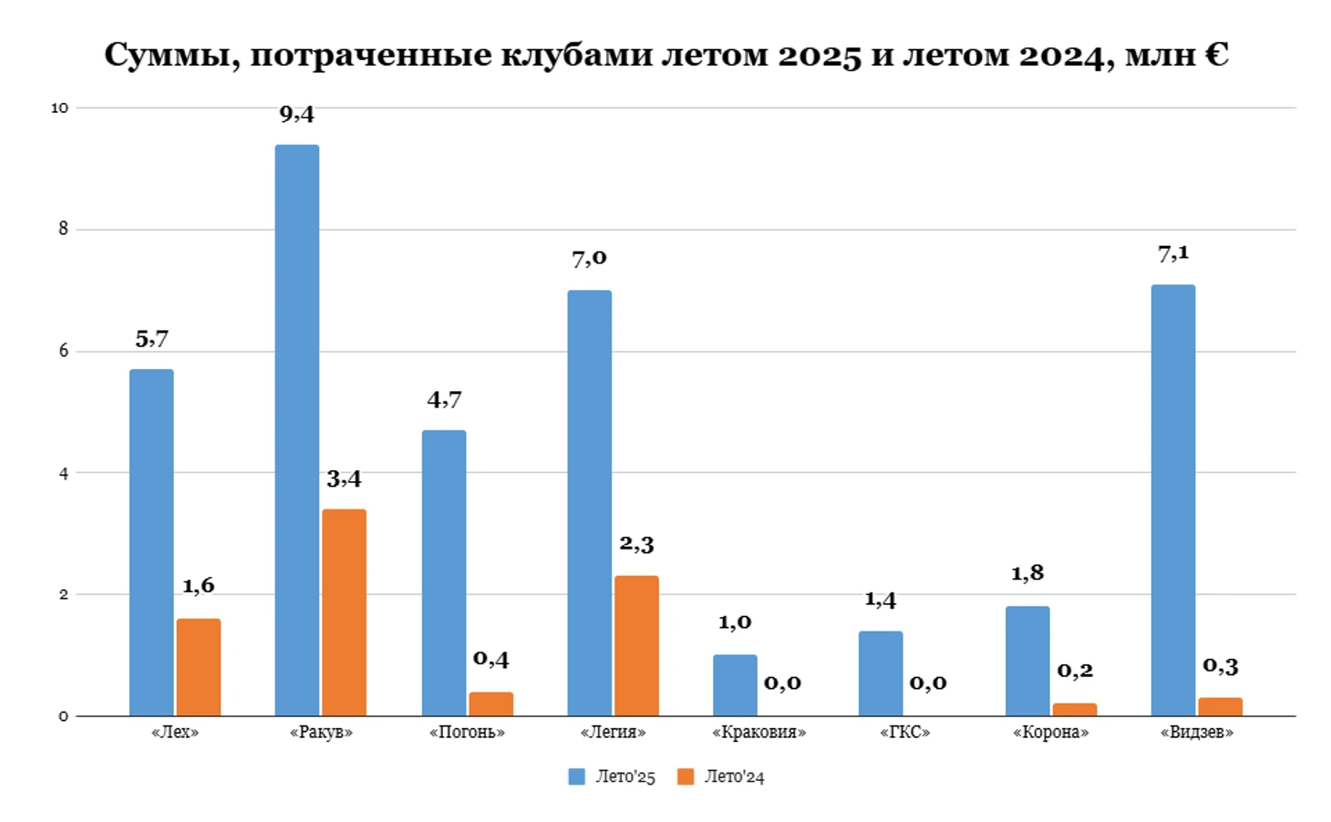 Число клубов, готовых тратиться на трансферном рынке, также выросло. Если год назад лишь три клуба («Лех», «Ракув» и «Легия») потратили больше миллиона евро, то летом 2025-го отметку в миллион преодолели сразу восемь клубов Экстракласы. Вообще, таких клубов должно быть больше. «Ягеллония» явно потратила больше миллиона евро, приобретя Эйзи Джексона, Давида Драхала и Юки Кобаяси, но сумма этих трех сделок официально неизвестна, поэтому transfermarkt их не учитывает. Таким образом, половина лиги потратила на трансферном рынке больше миллиона евро.