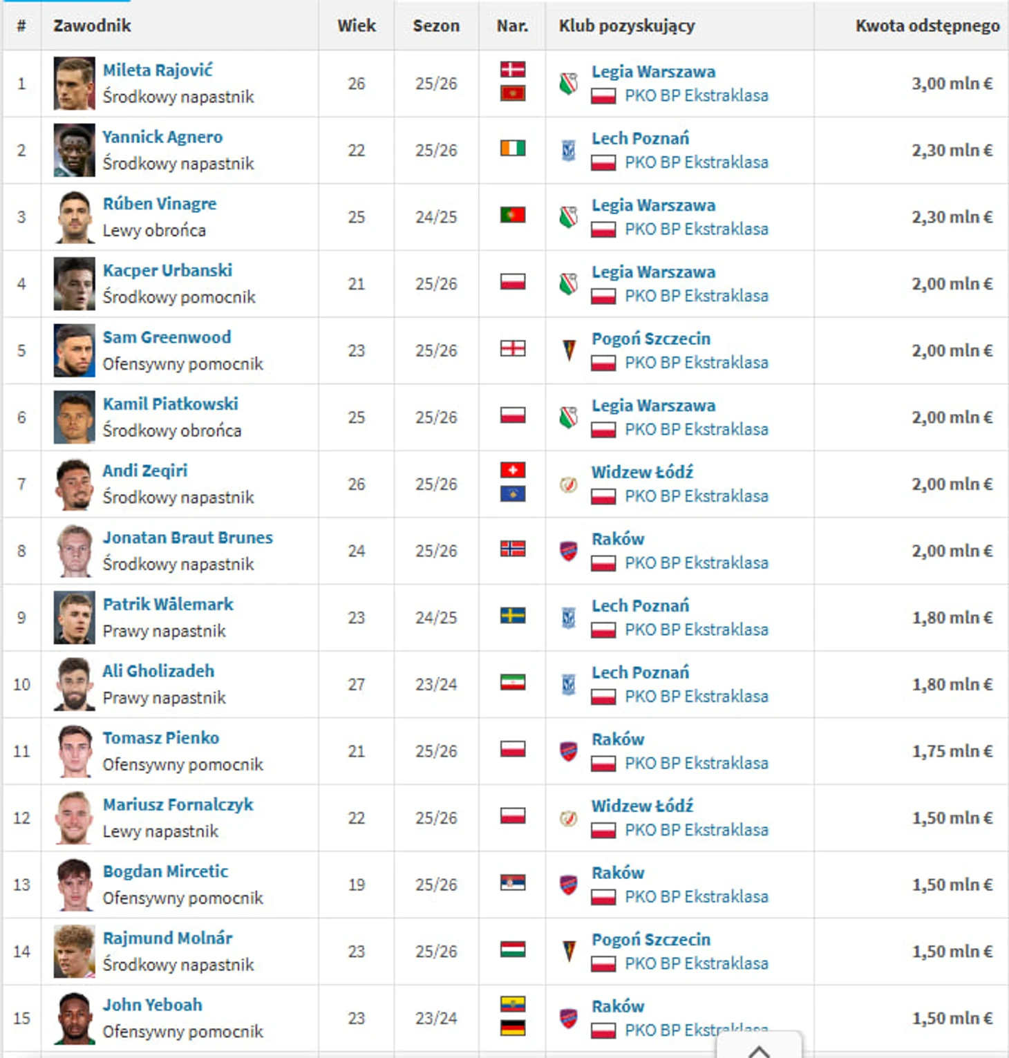 Для «Ракува» рекордным в истории стал выкуп арендованного у «Лёвена» Джонатана Бреут-Брюнес. Ченстоховцы за него заплатили все те же два миллиона.