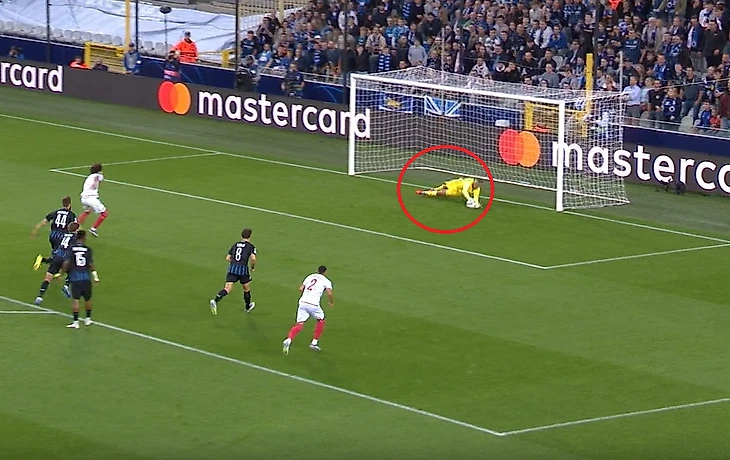 Вратарь «Брюгге» так обрадовался после сэйва, что тут же замахал руками на судью. Партнеры по команде оттащили, но от желтой карточки не защитили – неспортивное поведение.