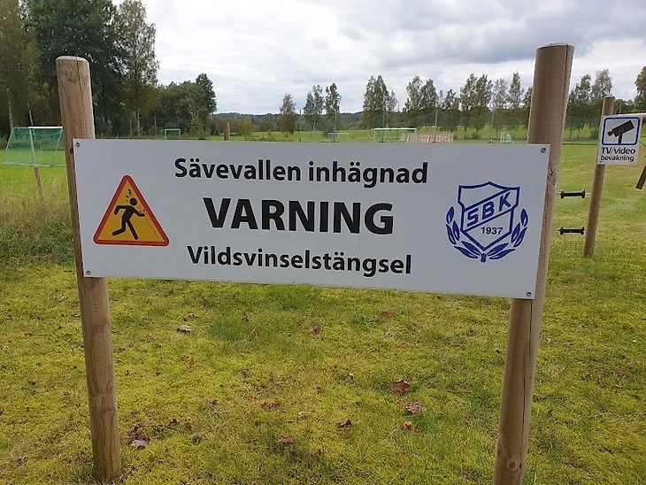 Обратите внимание на предупреждающую табличку. Пару лет назад клуб устал от того, что дикие кабаны, роющие землю в поисках еды, крушат их футбольное поле. С помощью игроков основного состава и волонтеров вокруг поляны был возведен электрический забор из двойной проволоки и проблема была решена.