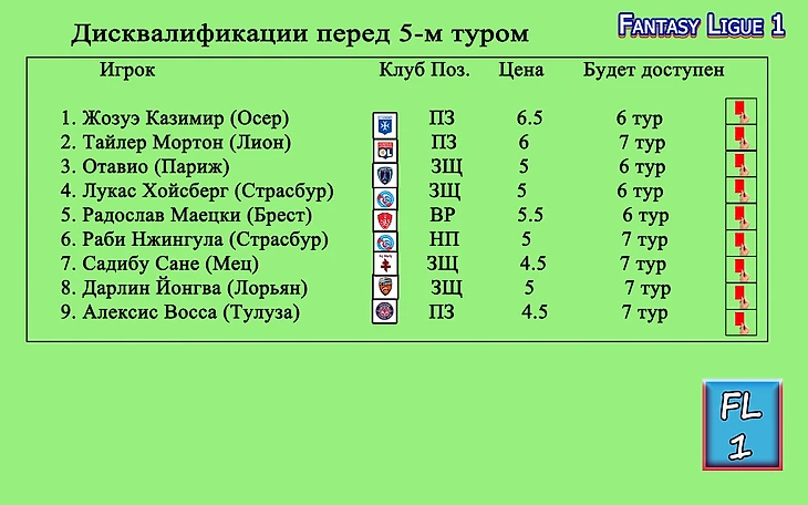 Дисквалификации:Мортон (Лион, ПЗ, 6)