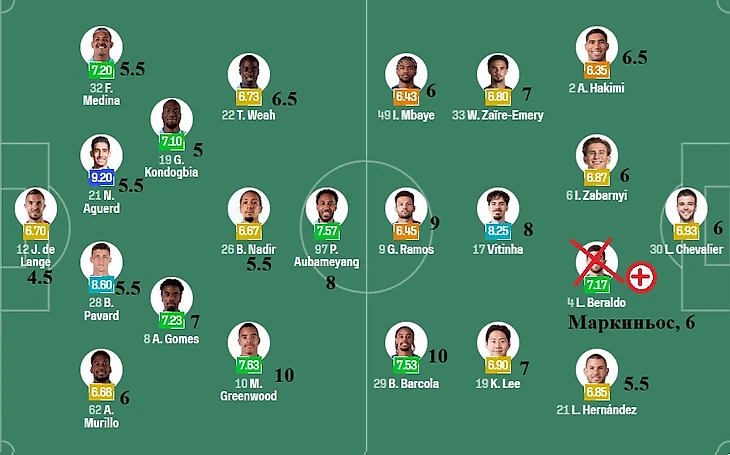 Под вопросом: Гуири (Марсель, НП, 9.5), Траоре (Марсель, ПЗ, 7.5), Агерд (Марсель, ЗЩ, 5.5), Кварацхелия (ПСЖ, ПЗ, 10)