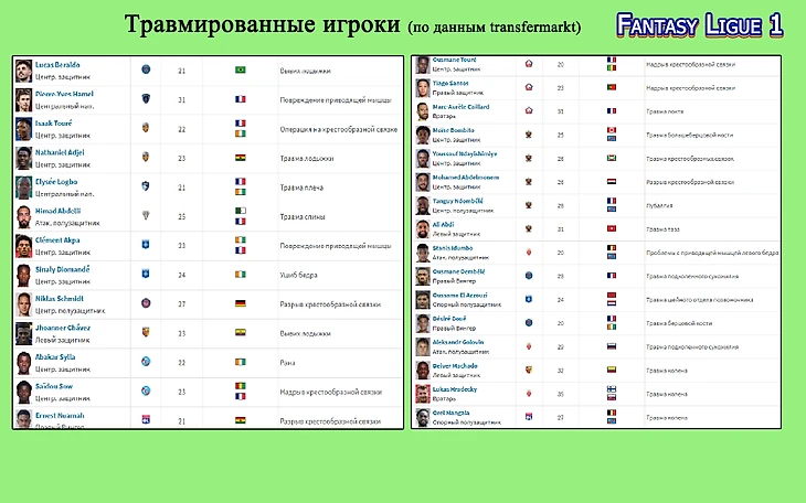 Травмы: Дембеле (ПСЖ, ПЗ, 11.5), Дуэ (ПСЖ, ПЗ, 9.5), Жоау Невеш (ПСЖ, ПЗ, 7.5), Белардо (ПСЖ, ЗЩ, 5.5)