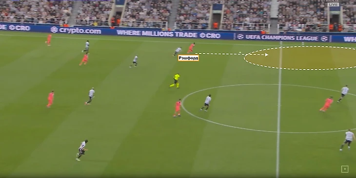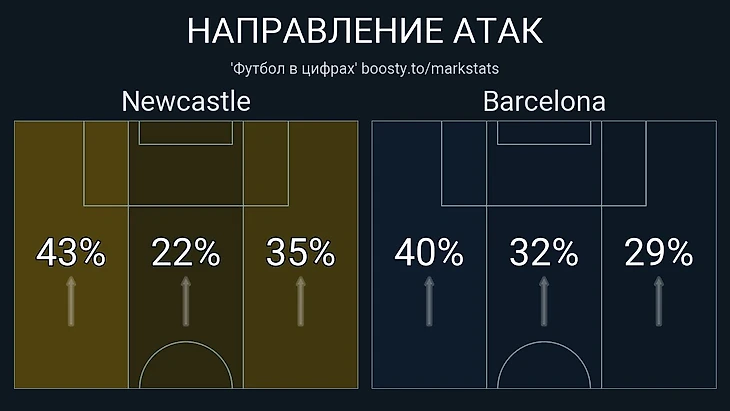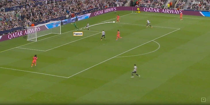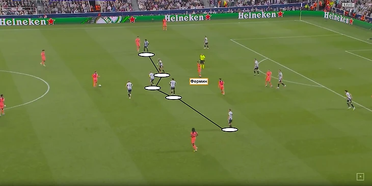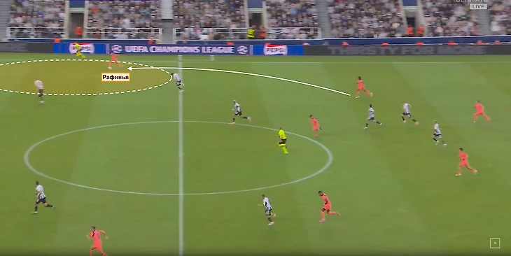 Под такой характер давления соперника «Барселона» готова была адаптировать скорость и направленность своих атак. То есть мяч двигался в том числе и вертикально, игроки пробовали доставлять мяч в зоны в атакующую линию, которые были относительно открыты и уязвимы вследствие прессинга «Ньюкасла».