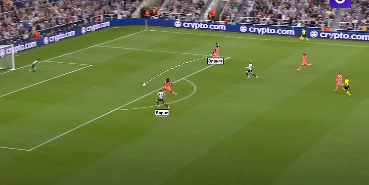 Наибольшую опасность для «Барселоны» представляли фланговые игроки «Ньюкасла» — Барнс слева и Эланга справа. Эланга — скоростной игрок с хорошей техникой, всегда был готов включиться под заброс за высокую линию каталонцев. Пару моментов в первые 15-20 минут пришли после передач от Эланги в штрафную площадь.