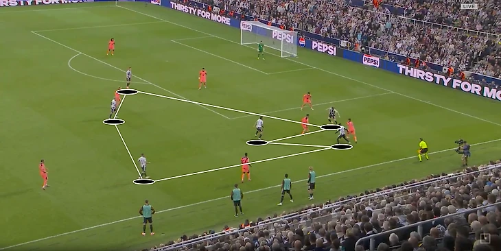 После продолжительного высокого прессинга «Ньюкасл» опускался «отдохнуть» в средний блок на свою половину поля. Команда перестраивалась в 4-5-1, где пятерка в центральной зоне действовала компактно. Таким образом, они стремились разорвать связь Френки и Педри с играющим между линий Фермином.