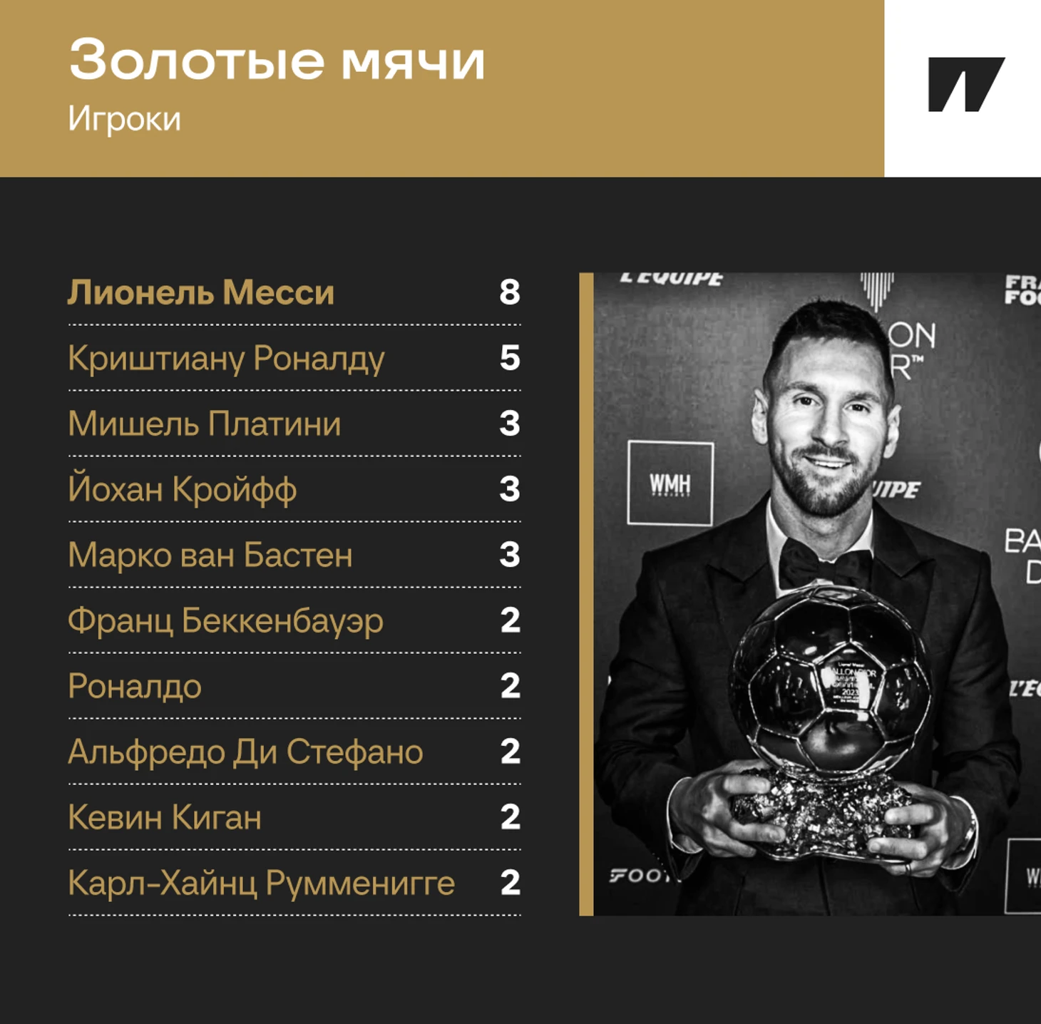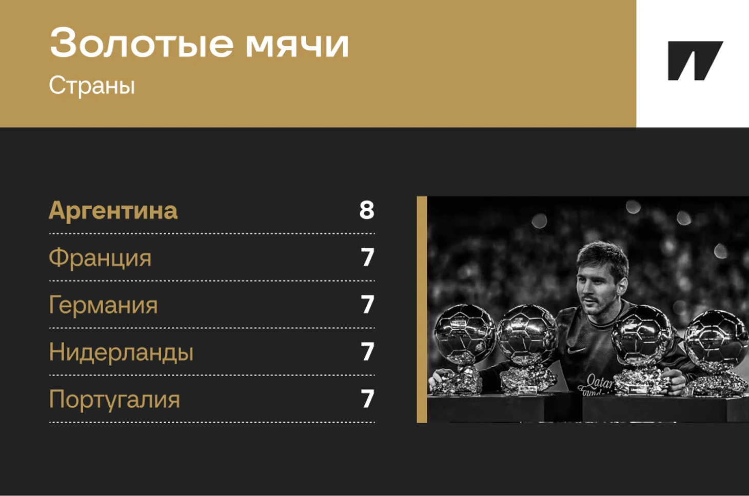 Благодаря Месси Аргентина лидирует среди стран по количеству «Золотых мячей». Как вы догадались, все восемь наград у Месси.