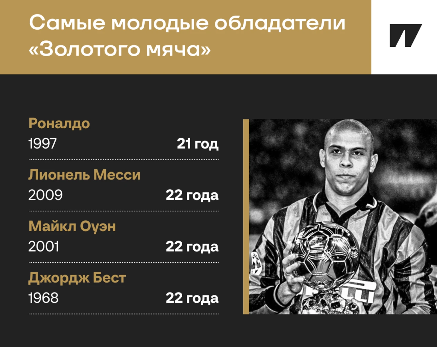 Бразилец Роналдо получил награду в 21 год – когда перешел из «Барсы» в «Интер». В топе самых молодых вместе с Месси и Оуэном есть Джордж Бест.