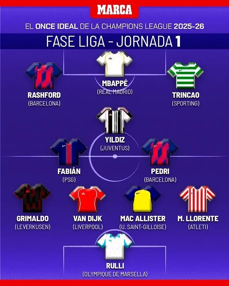 Первый тур Лиги чемпионов сезона-2025/26 подарил массу ярких матчей — и Marca уже сформировала команду недели.