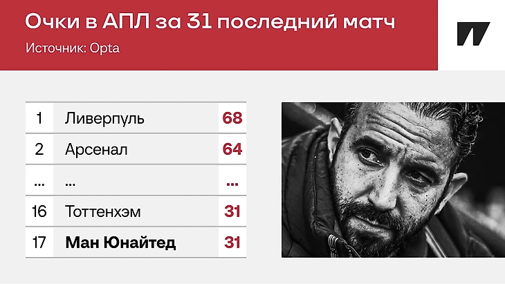 После матча с «Сити» Opta подвела ужасный итог 10 месяцев Аморима в клубе: с 25 ноября (первый матч Рубена в «МЮ») набрал 31 очко в 31 матче. Худший результат среди клубов, которые не вылетали.