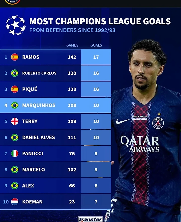 Благодаря им мы узнали, что только один из них до сих пор продолжает играть. Это защитник «ПСЖ» Маркиньос, в активе которого 108 матчей в ЛЧ и 10 голов. Причем десятый он как раз забил в ворота «Аталанты», что поставило его на четвертое место.