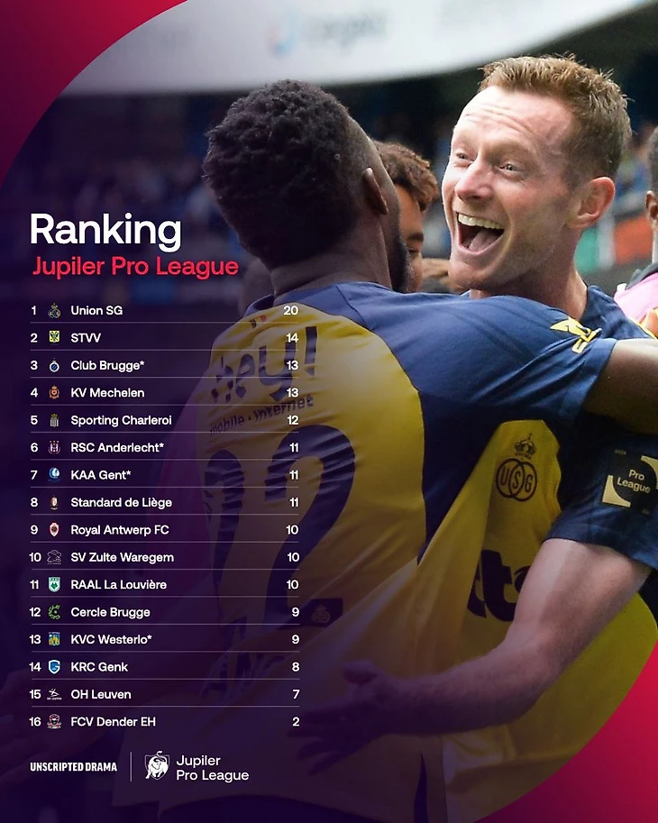 Вот таблица чемпионата Бельгии по итогам восьмого тура – с учетом перенесенного матча «Шарлеруа» и «Генка», но без учета еще двух отложенных матчей («Андерлехт» – «Гент» и «Брюгге» – «Вестерло»; у всех этих команд – по звездочке, означающей матч в запасе).